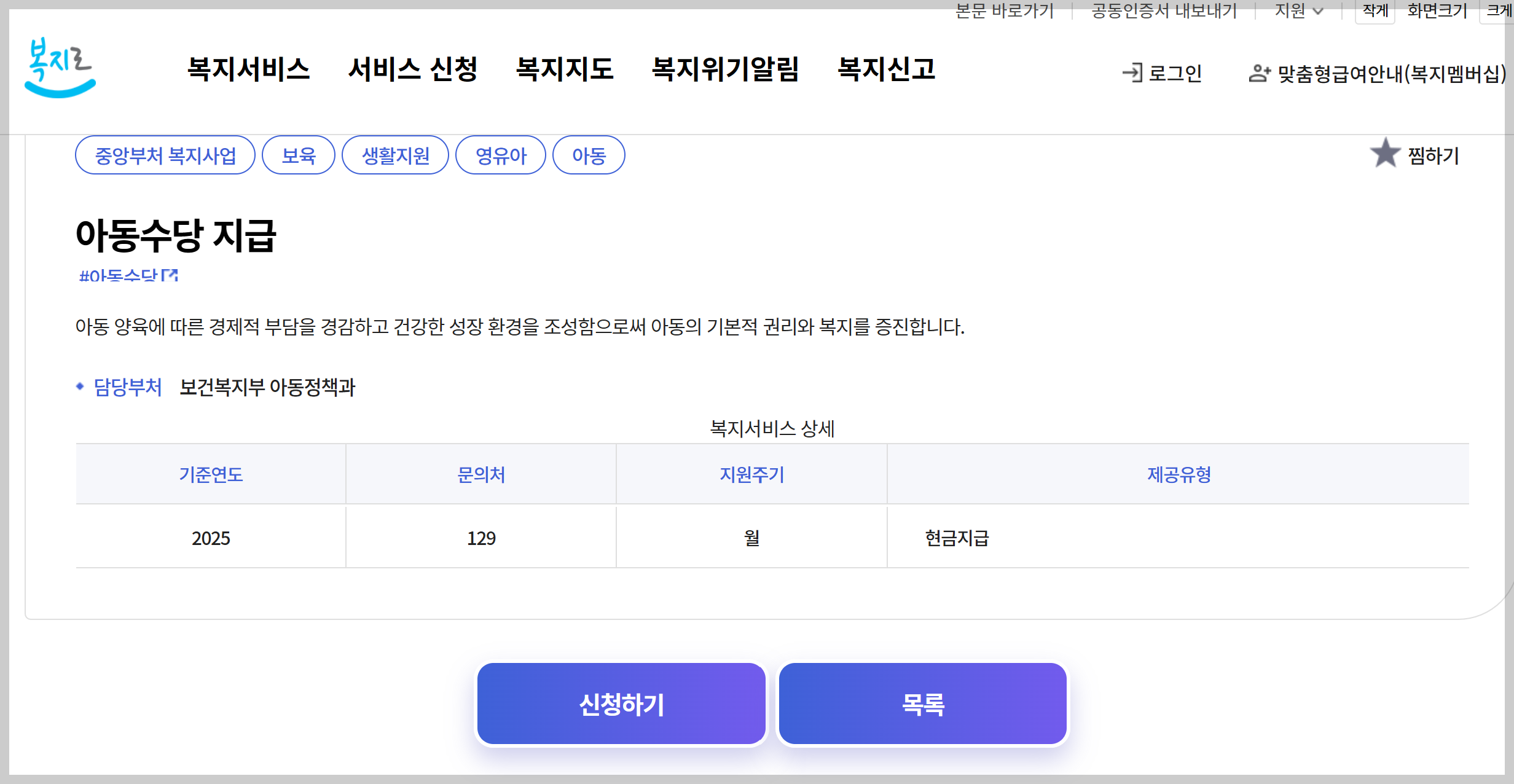 | 신청방법 | 주민센터 방문 또는 복지로 홈페이지 온라인 신청 |